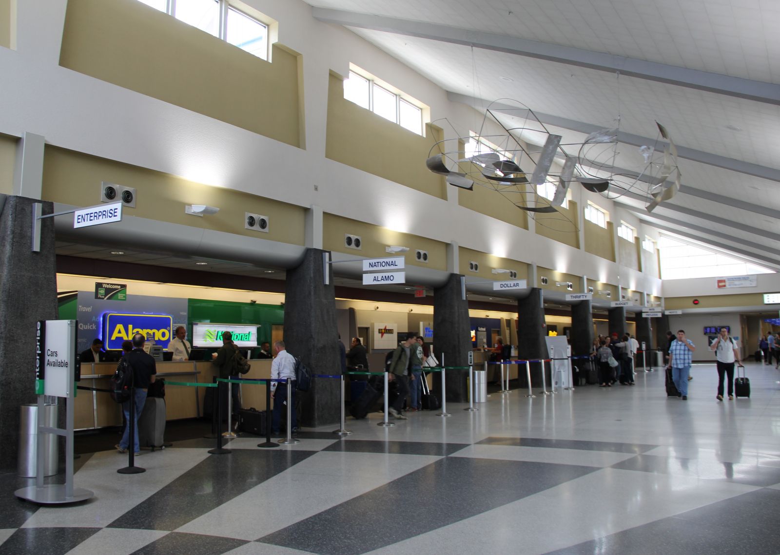 The rental car counters are located in the Ground Transportation Center, next to the A/B Concourse Baggage Claim Area at the north end of the terminal building.